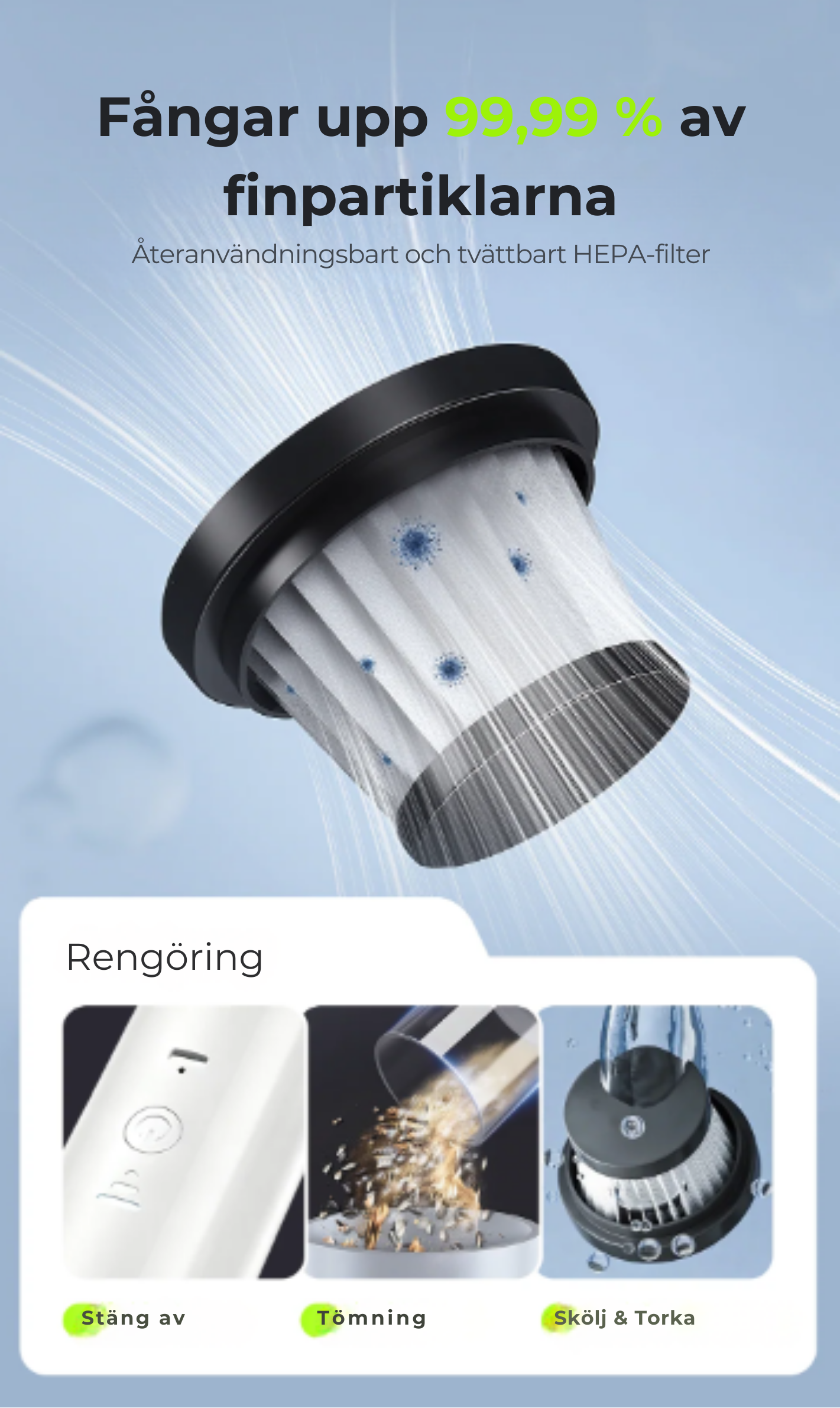 Den kraftfulla sugförmågan tar hand om både synlig smuts och de små partiklarna som annars stannar kvar.
