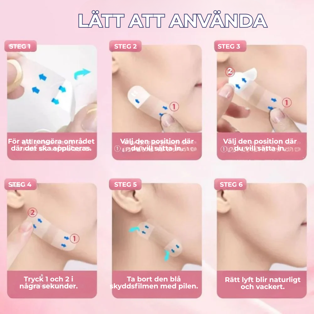 Tejpstripparna är utformade för att minska synligheten av slapp hud, rynkor och linjer genom en mild uppstramning av huden. Resultatet blir en mer definierad käklinje, slätare hud och ett mer förfinat utseende – oavsett om du ska på fest, till jobbet eller bara vill se extra fräsch ut.