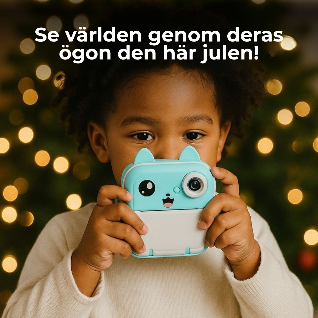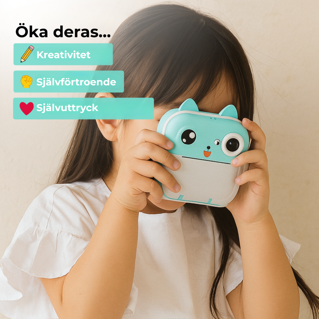 Med denna bläckfria, omedelbara kamera kan barnen ta bilder, skriva ut dem direkt och börja pyssla på en gång. Den fungerar med värmekänsligt papper istället för bläck, vilket gör den helt ren och säker. Små händer kan hålla, trycka och skapa – och varje svartvitt foto blir ett eget litet konstverk som kan dekoreras med ramar, klistermärken eller egna teckningar.