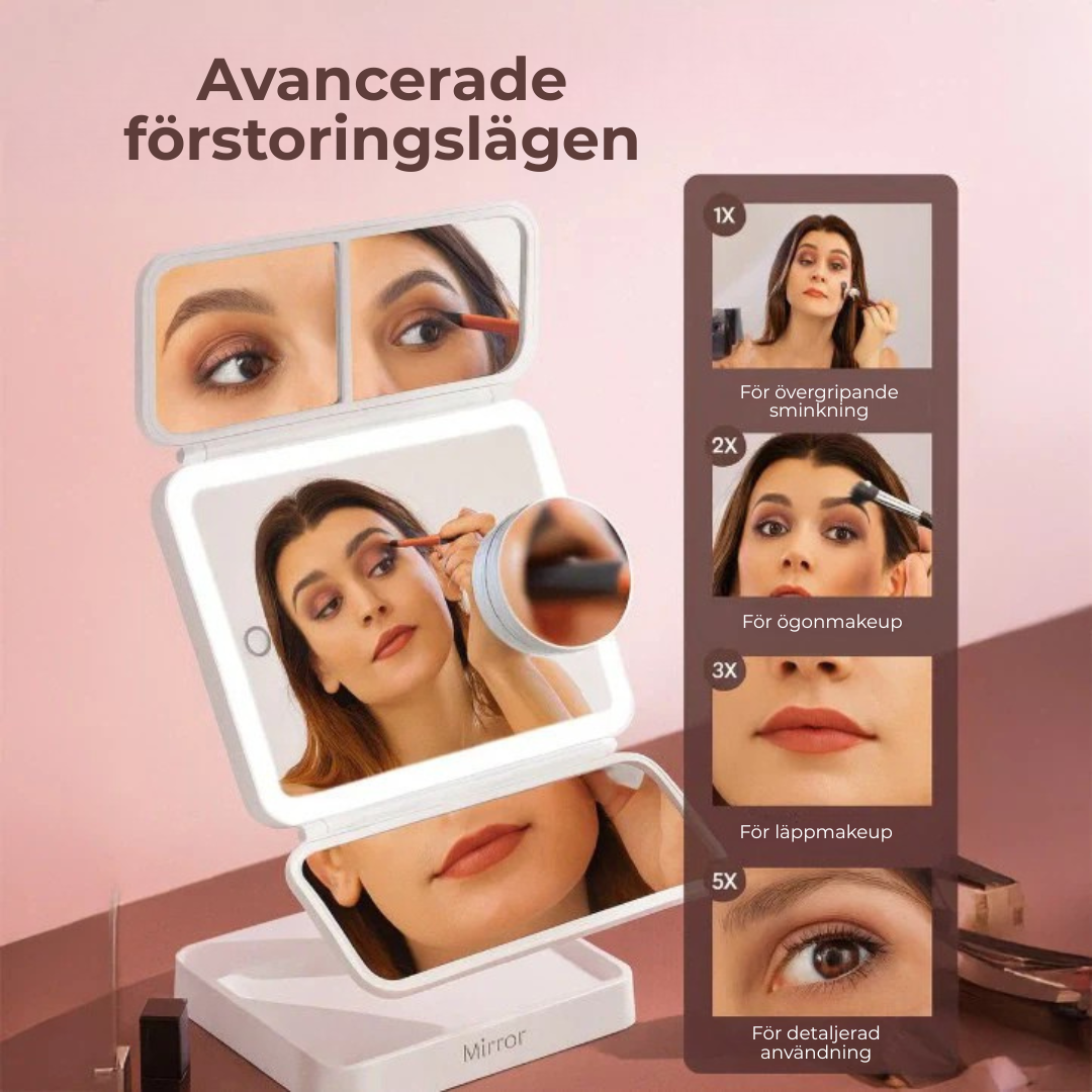 En bärbar spegel med 83 LED-lampor och 3X förstoring som låter dig se varje detalj klart och tydligt. Lättviktsdesignen gör att du kan fälla ihop den och ta med dig överallt – från hotellrum till sovrummet. Tre ljusinställningar (varmt, naturligt, kallt) säkerställer att ditt smink alltid syns i rätt ton.