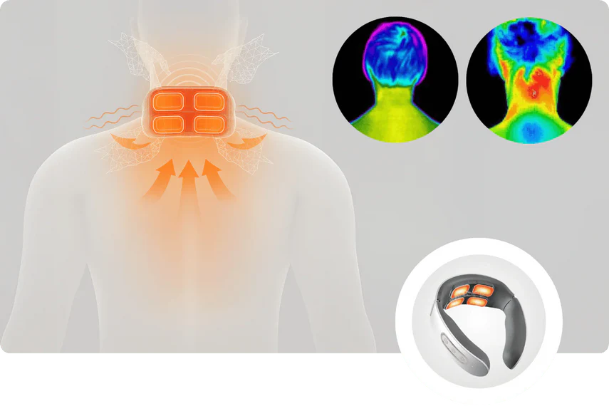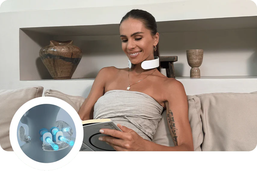Neckura™ arbetar med en unik kombination av EMS, värme och TENS-impulser. Den riktar sig direkt mot de djupaste musklerna i nacken, där spänningen faktiskt sitter.
