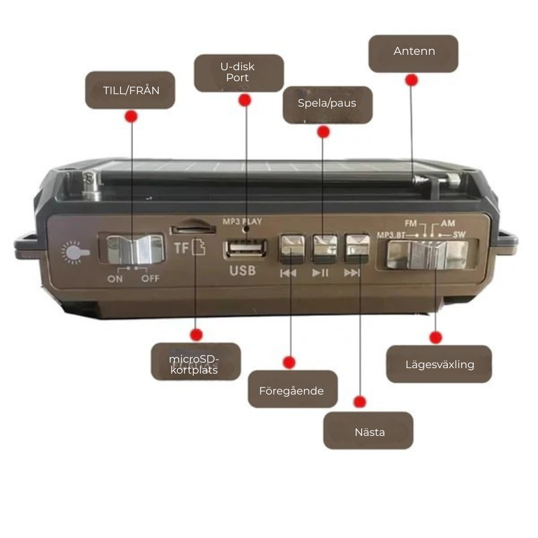 SaveWave™ är ett komplett överlevnadsverktyg: en inbyggd ficklampa för mörka kvällar, en powerbank för att ladda din telefon och ett kraftfullt SOS-signal för nödsituationer. Allt samlat i en robust enhet som fungerar med både en vev och solceller – så du kommer aldrig vara utan ström.