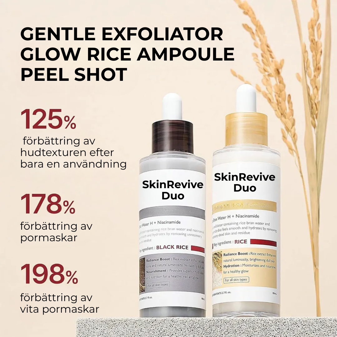Upptäck SkinRevive Duo, en mild men kraftfull hudvårdslösning som är designad för att omedelbart avlägsna död hud, rensa tilltäppta porer och ge en slätare, mer strålande hy. Detta 2-stegsset inkluderar White Rice och Black Rice-ampuller – båda fullpackade med niacinamid och risvatten för att ljusa upp, mjukgöra och vårda huden utan irritation.