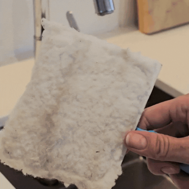 Skölj den bara under vatten eller lägg den i tvättmaskinen. Den är återanvändbar – inga engångsdukar behövs. -