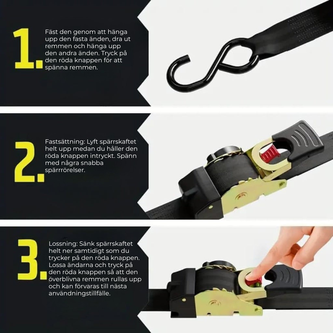 Du drar ut, hakar fast och spänner — klart på några sekunder.